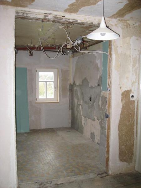 The bathroom had been divided into boys and girls toilets so the middle wall had to be removed and a new door frame constructed. Here, too, the walls and beams in the walls had been damaged by leaking water pipes and beams had to be replaced and walls rebuilt.