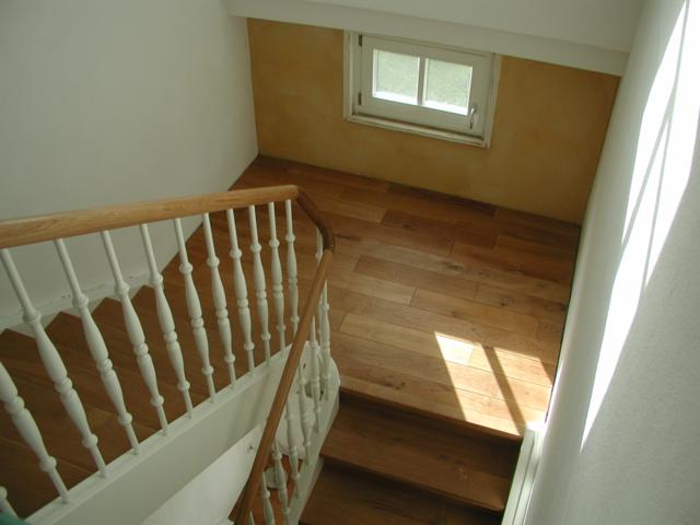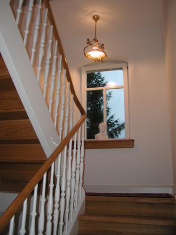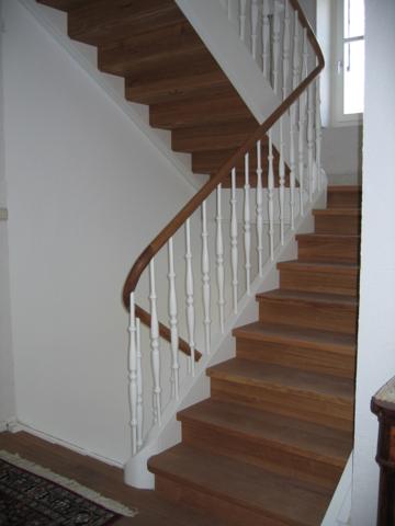 In a 4-story house the stairwell plays a central role. In our home there is one stairwell, centrally located, with 6 flights between the ground floor and the fourth floor. The flights have 7 or 8 steps each and connect one floor to a landing between it and the next floor and from the landing to the next floor itself. The staircases were originally oak, but after more than a century of use were beyond repair. The oak steps had been repaired by routing out the front edge and gluing and nailing pine strips in to correct for the worn edge. Then the steps were filled with a leveling mortar and covered with PVC floor covering. This gray covering had worn through in places and peeled off in other places. More seriously, perhaps, water damage had all but destroyed one of the stringers and a few of the steps on the second floor and we are fortunate that the stairs never gave way while supporting many heavy pieces of furniture and bags of cement. Shortly after moving in we knew we would have to replace the stairs, an expensive and daunting project. We decided to wait with this repair until most of the heavy work in the upper floors had been finished so as not to put unnecessary wear and tear on new stairs. Finally, after about 2-1/2 years we felt it was time to undertake the project and we called our carpenter. He did the measurements and began planning. We decided on oiled oak steps, risers and hand rails and white laquered stringers and banister staves. The idea was to reproduce the original staircase as closely as possible. In January 2008 work began. The old staircase had a covered underside which had to be removed first. The covering was made of wooden laths and clay, covered with plaster and wallpaper that had many coats of paint on it. Removing this was an extremely dirty job and all doors in the house had to be taped shut while it was being performed. The old stairs were removed one flight at a time and the new flights were built on the floor above and lowered down into place by two strong men.